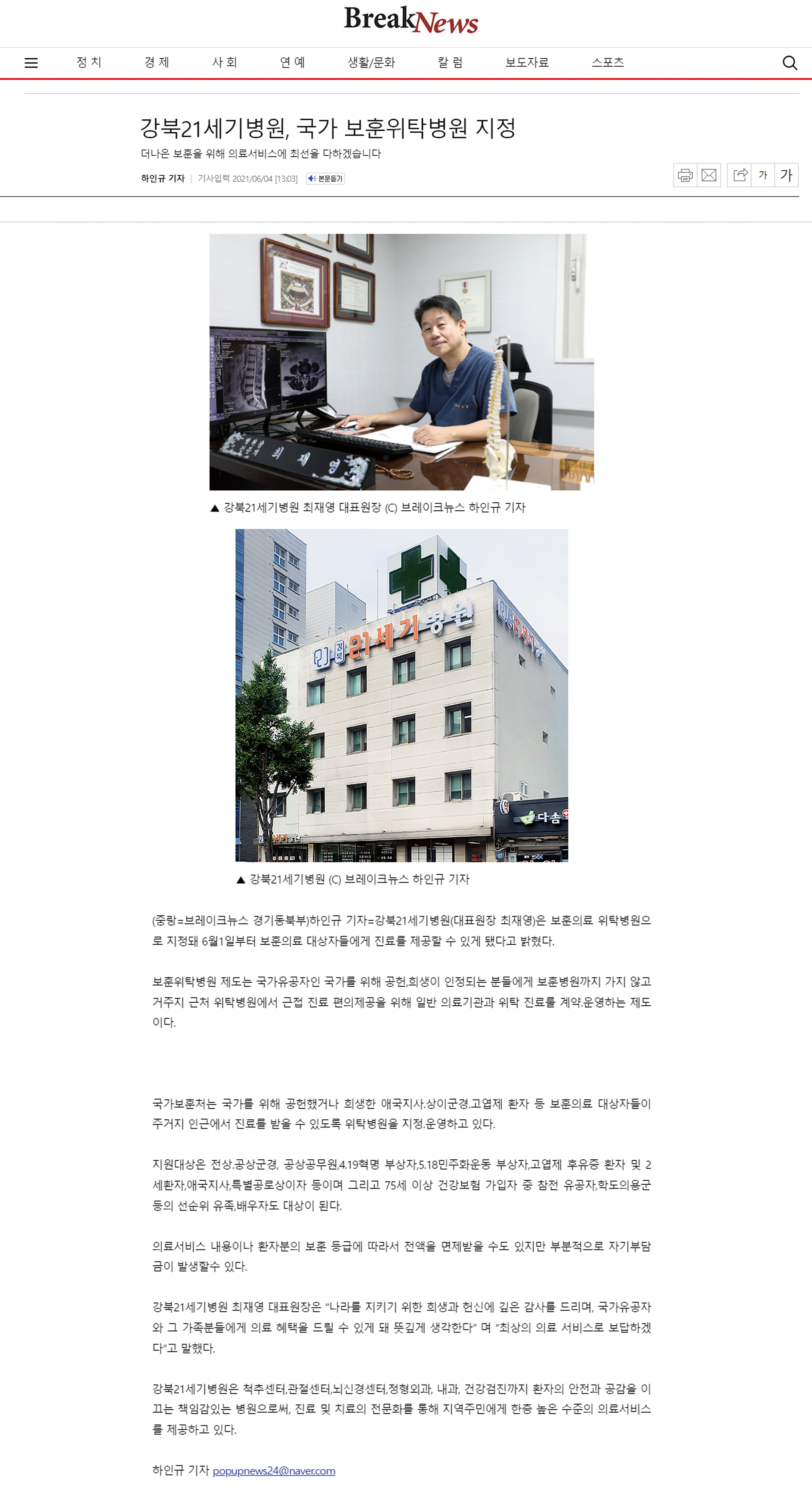 Á¦¸ñ [ºê·¹ÀÌÅ©´º½º] °­ºÏ21¼¼±âº´¿ø, ±¹°¡ º¸ÈÆÀ§Å¹º´¿ø ÁöÁ¤